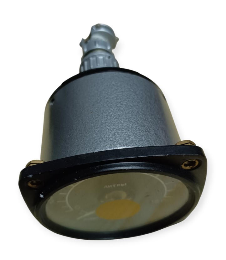 Oryginalny radziecki lotniczy wskaźnik ilości paliwa, przeznaczony do montażu panelowego w kokpitach samolotów i śmigłowców wojskowych.